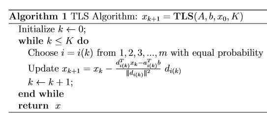 where $E \in \mathbb{R}^{m \times n}$ and $f \in \mathbb{R}^m$. Here, $|E \mid f|_F$ denotes the Frobenius matrix norm and $(E \mid f)$ denotes the $ m \times (n + 1)$ matrix whose first $n$ columns are the columns of $E$, and the In various engineering and statistics applications where a mathematical model reduces to the solution of an over-determined, possibly inconsistent linear equation $Ax \approx b$, solving that equation in the TLS sense yields a more convenient approach than the ordinary least squares approach, in which the data matrix is assumed constant and errors are considered right-hand side $b$. In this project, we derived a iterative algorithm (see Algorithm 1 above) for solving Total Least Square problem based on randomized projection.